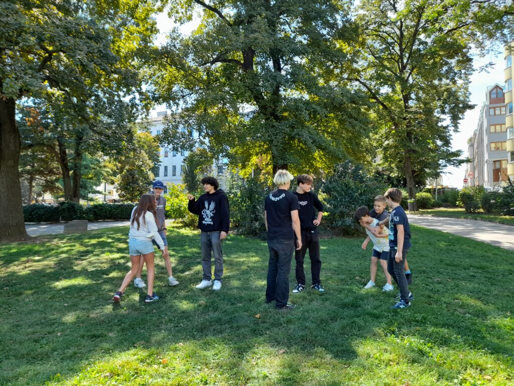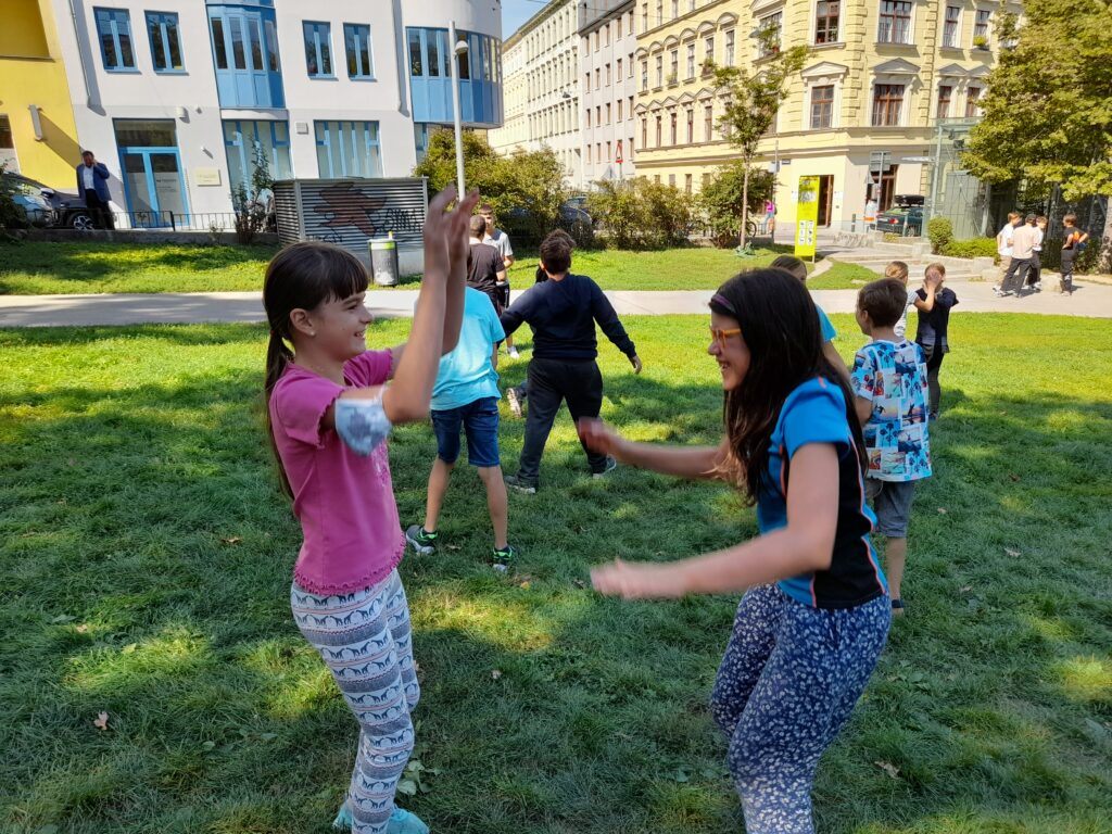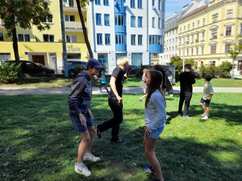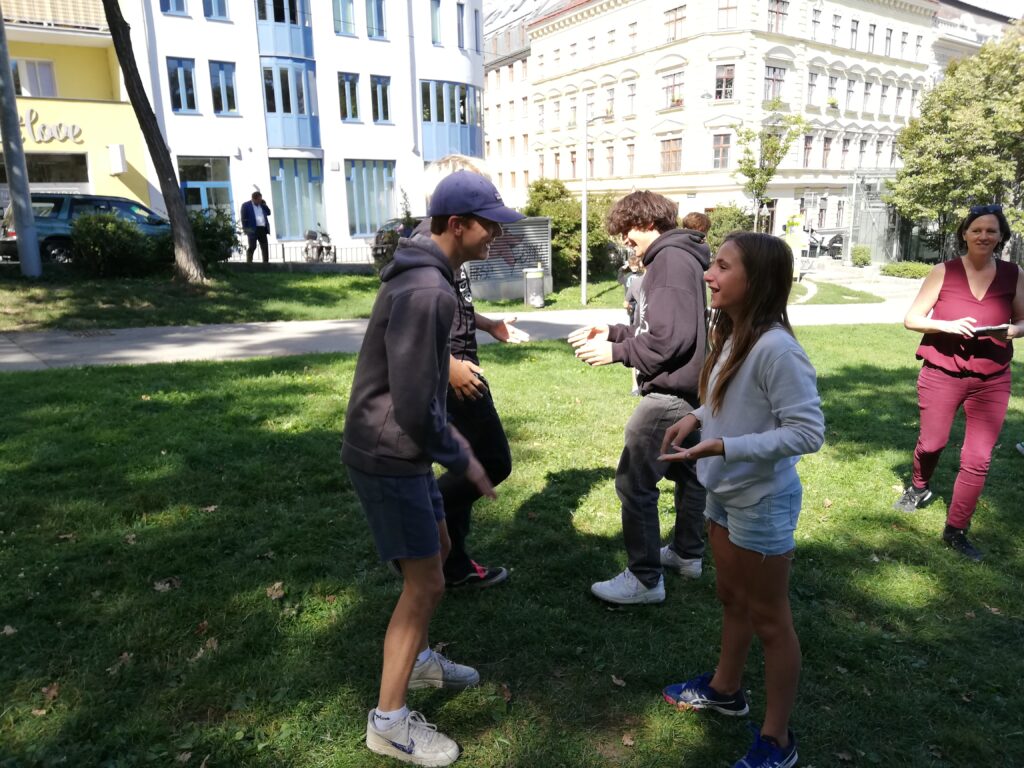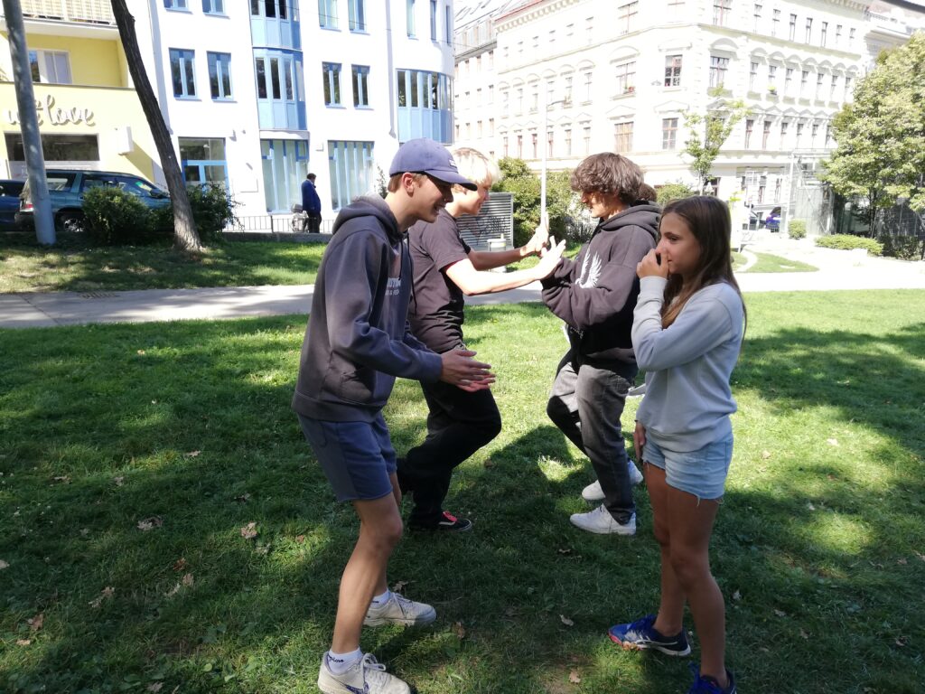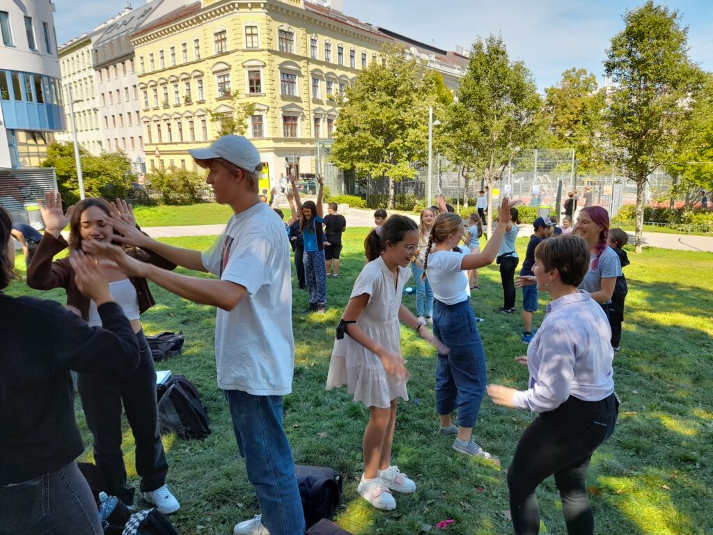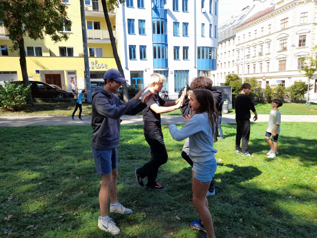 Endlich konnten sich die 2A und 8A im neuen Schuljahr wieder treffen und ihre bereits im Vorjahr geknüpften Kontakte auffrischen. Die Freude war auf beiden Seiten groß (hoffentlich ;)). Vor den Sommerferien haben sich die beiden Klassen mit kreativen szenischen Spielen im Währingerpark in die Ferien verabschiedet. In diesem Jahr ging es im Anschluss an die Begrüßungsspiele um spielerische Geschicklichkeit und Koordination sowie den Austausch über persönliche und schulische Ziele im diesjährigen Schuljahr. Den Klassenvorständinnen Christine Hecke und Nora Sulan wurde es ganz warm ums Herz beim fröhlichen Miteinander von Groß und Klein.