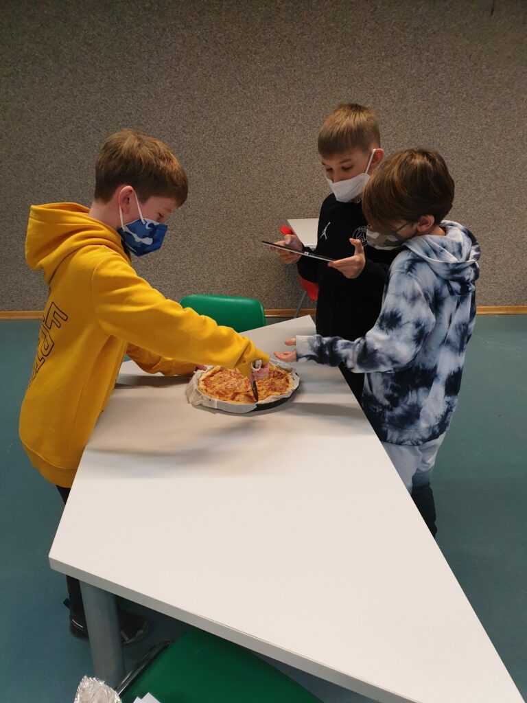 Wir teilen in zwei Hälften, danach in vier Viertel, …… Dazu verwendet die 1B selber gebackene Kuchen und Pizzen in den Formen eines Rechtecks und Kreises.