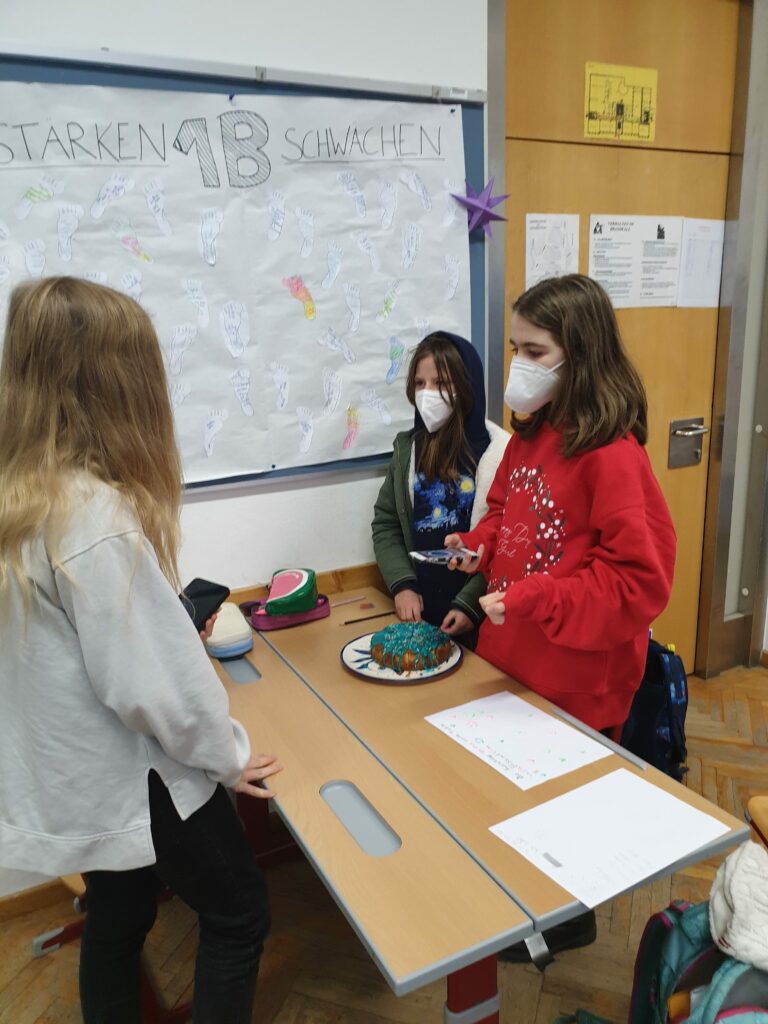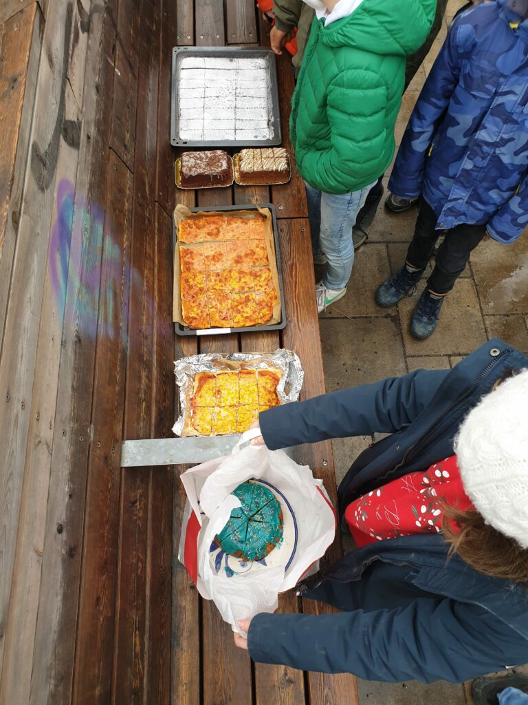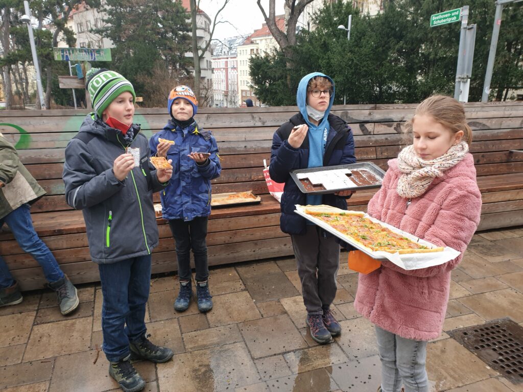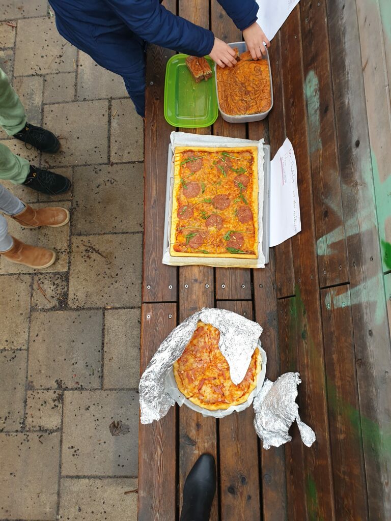 Nach dem Dreh ging es mit den Blechs und Säcken voller geteilter Kuchen und Pizzen in Schubertpark. Dort konnte sich die 1B in Ruhe stärken!