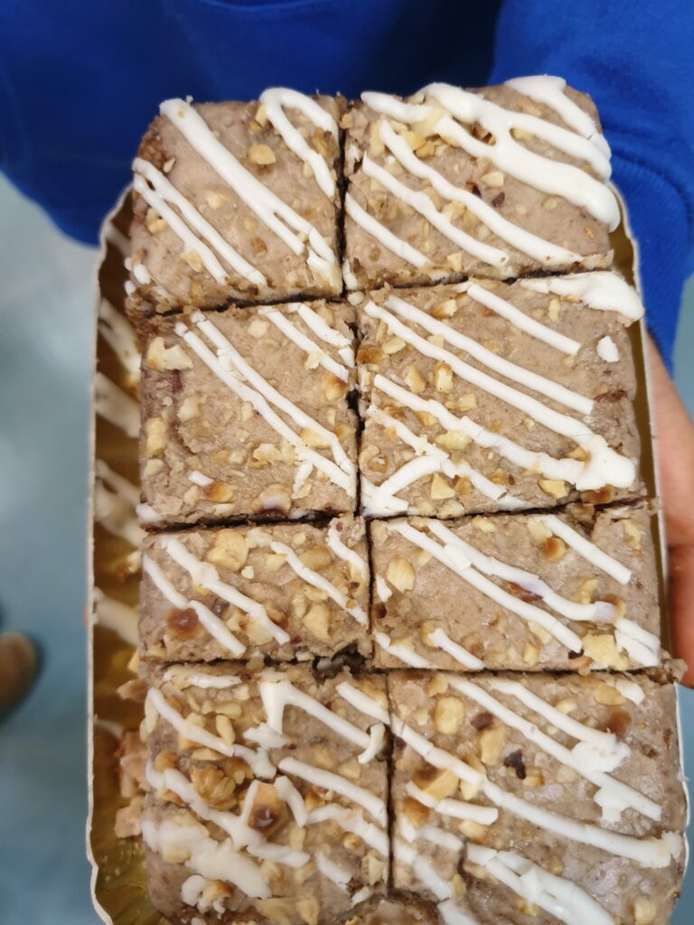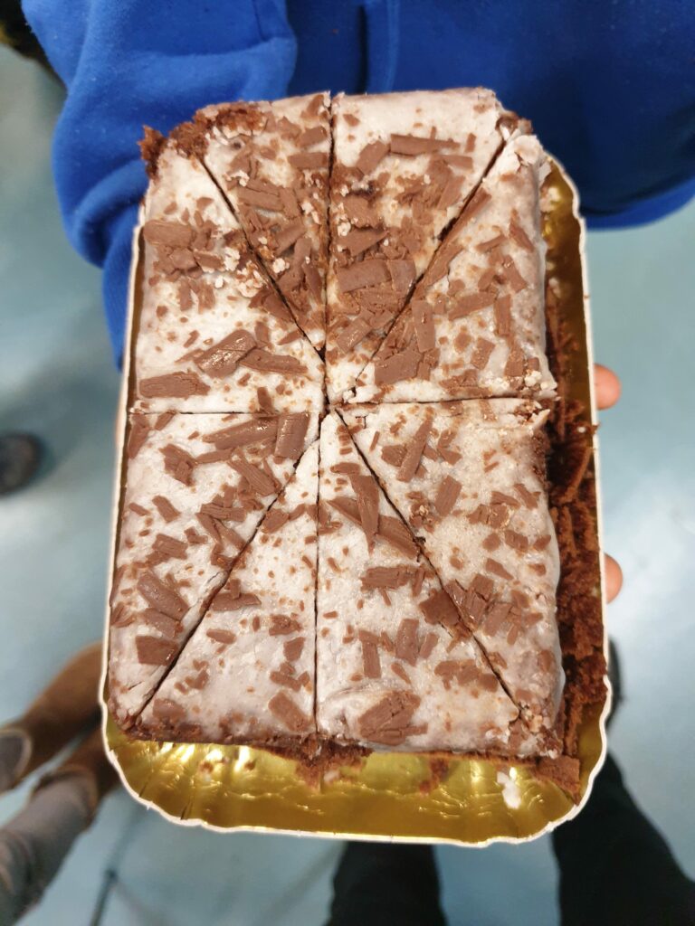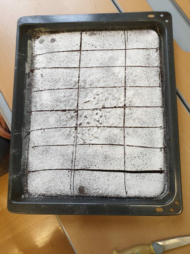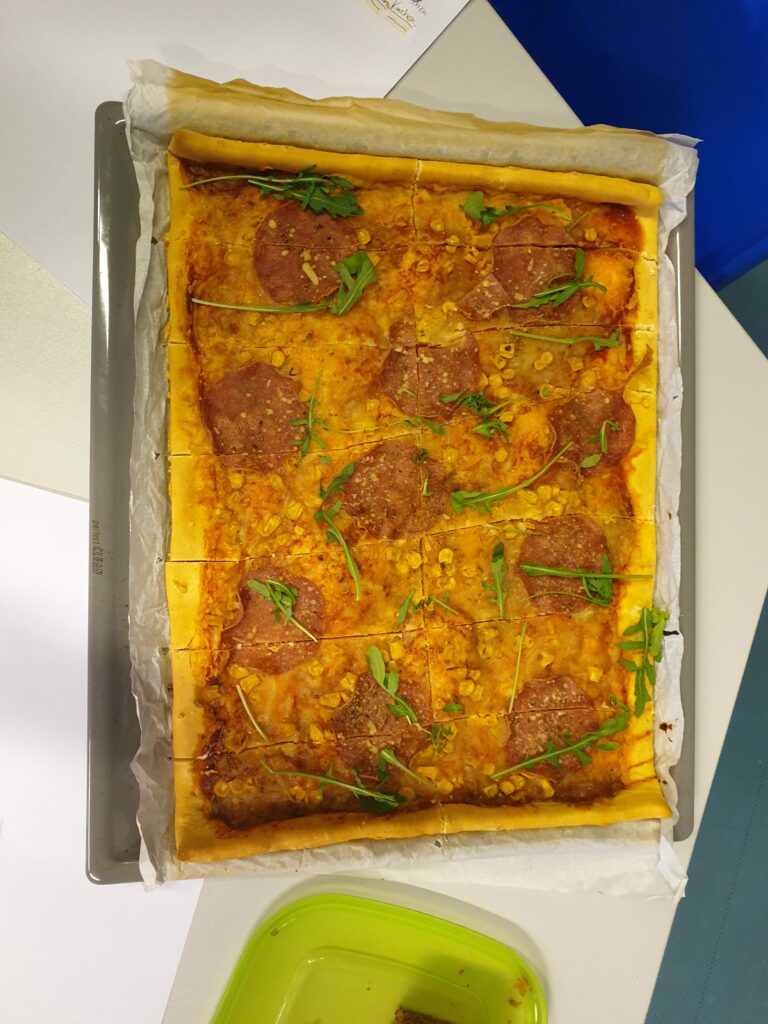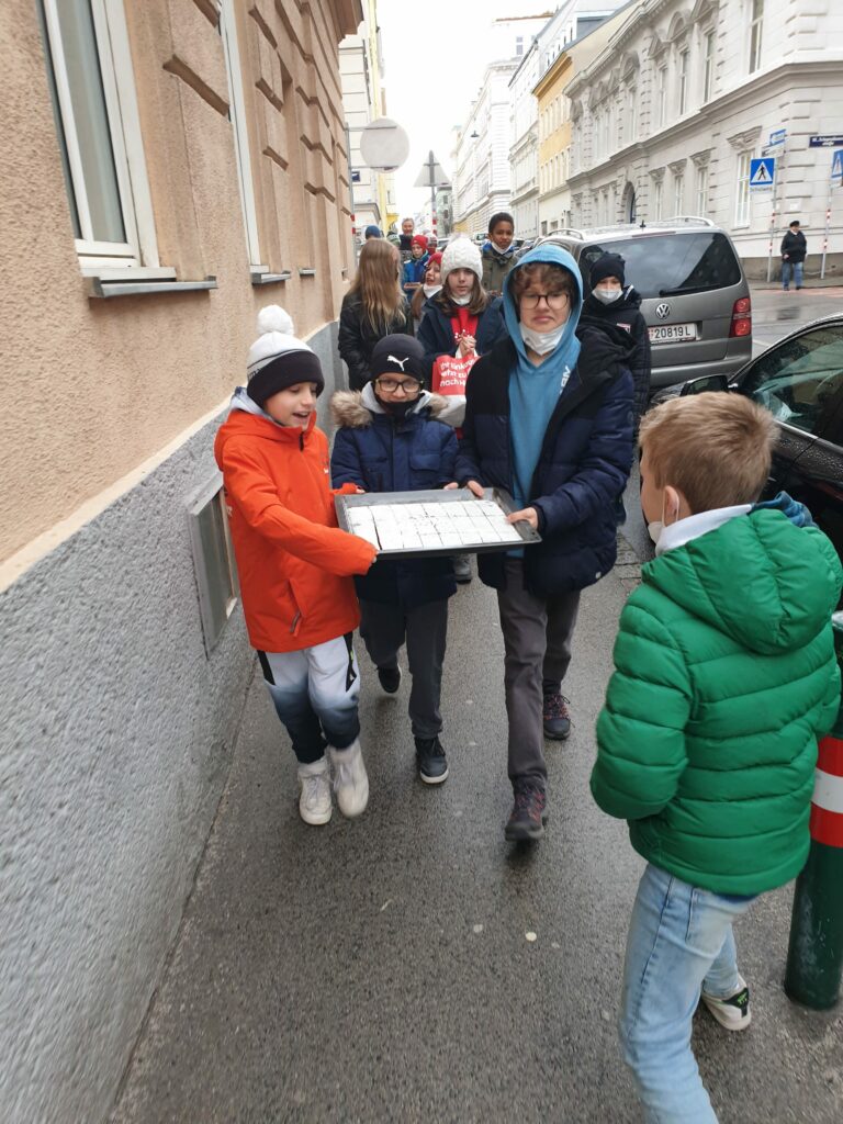 Nach dem Dreh ging es mit den Blechs und Säcken voller geteilter Kuchen und Pizzen in Schubertpark. Dort konnte sich die 1B in Ruhe stärken!