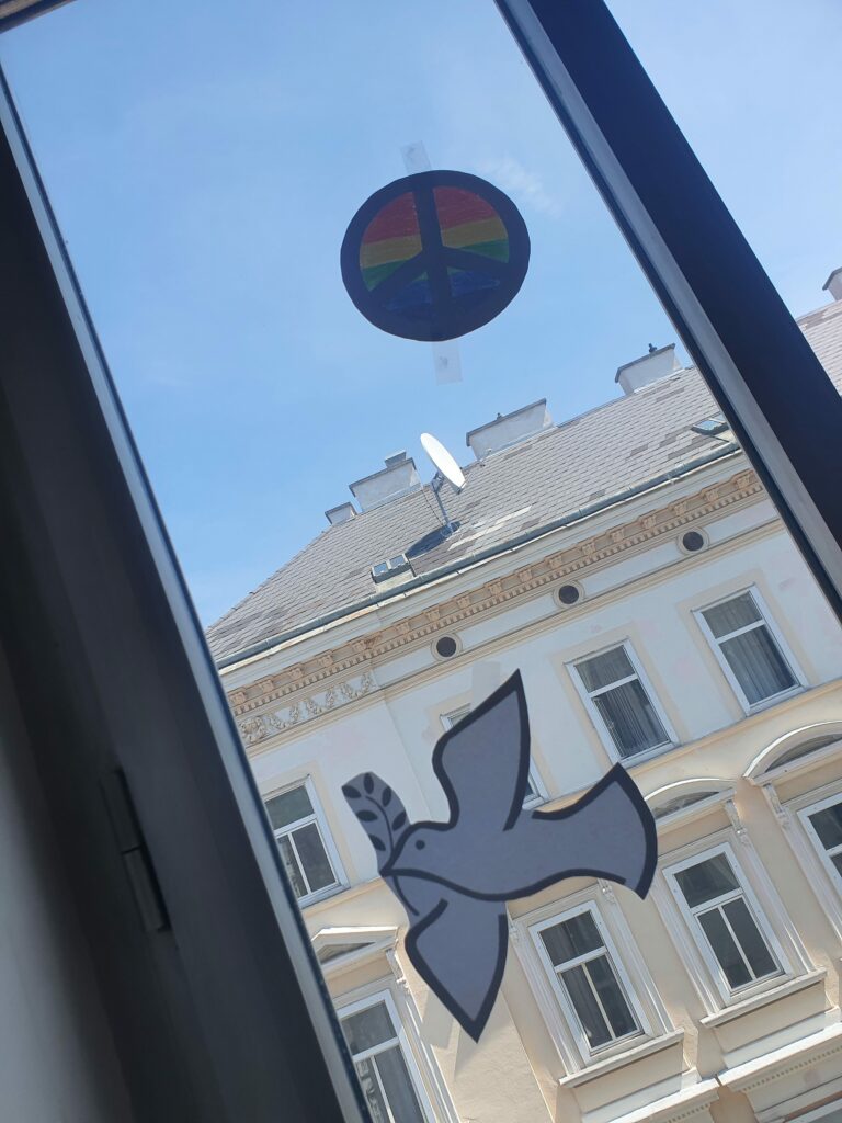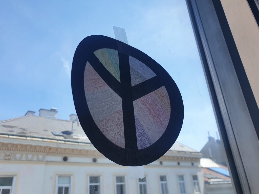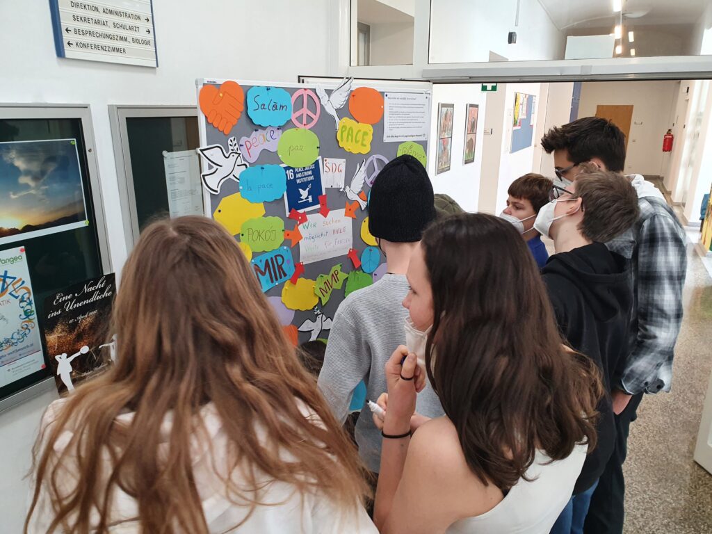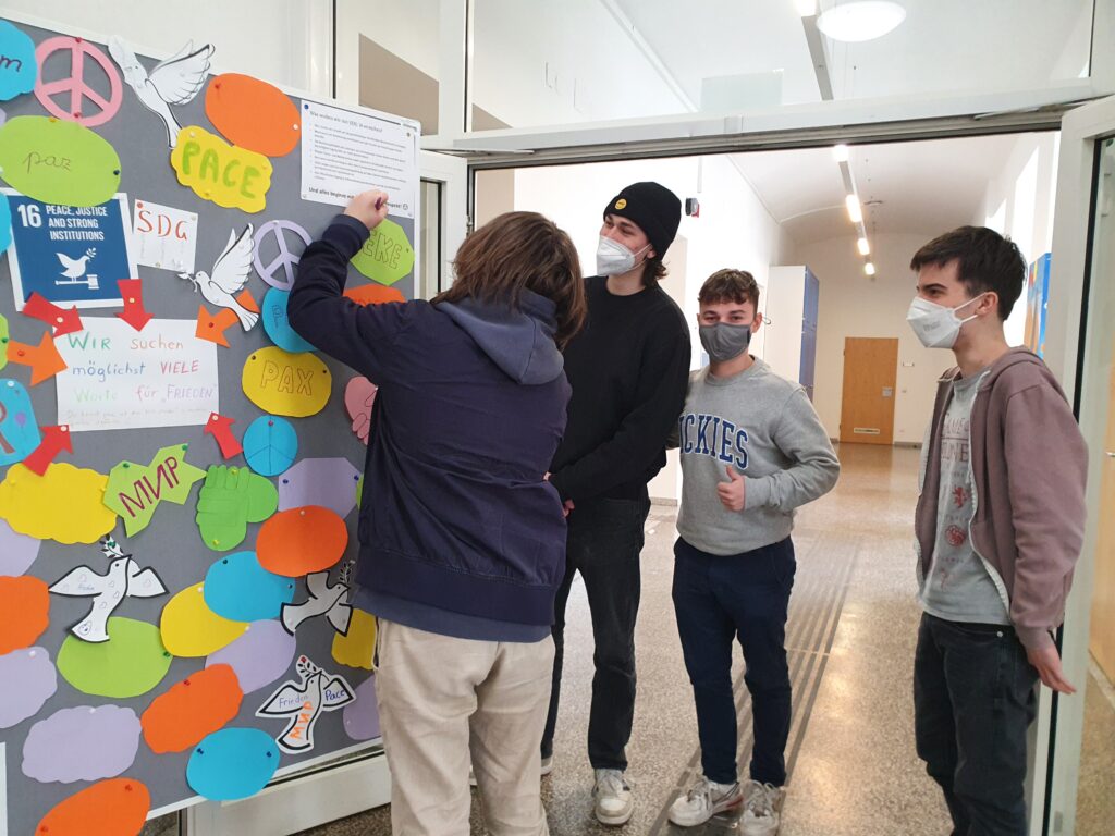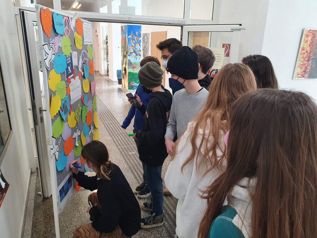 Bald darauf adaptierten wir unsere Wand und nutzen sie, um möglichst viele Worte für „Frieden“ zu suchen. Innerhalb kurzer Zeit wurde die Wand mit über 20 Worten ergänzt.