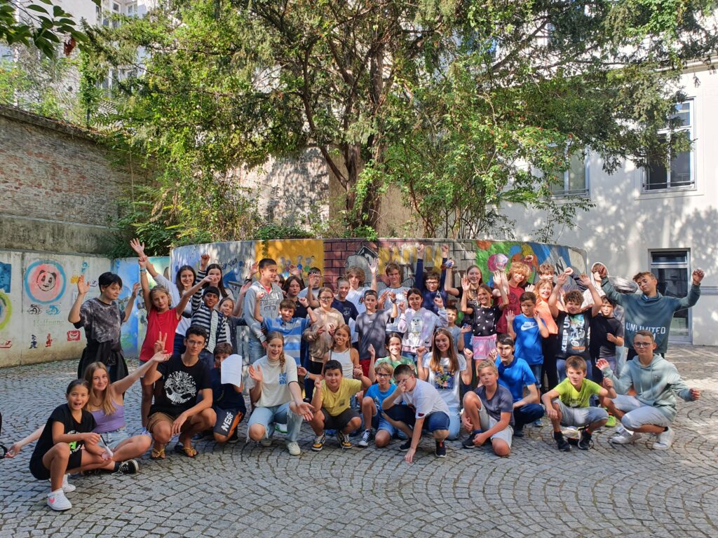 Zum Abschluss eines erfolgreichen Tages, gab es noch ein Gruppenfoto der beiden Partnerklassen im Hof.