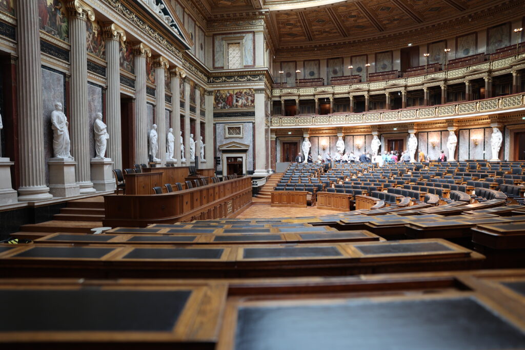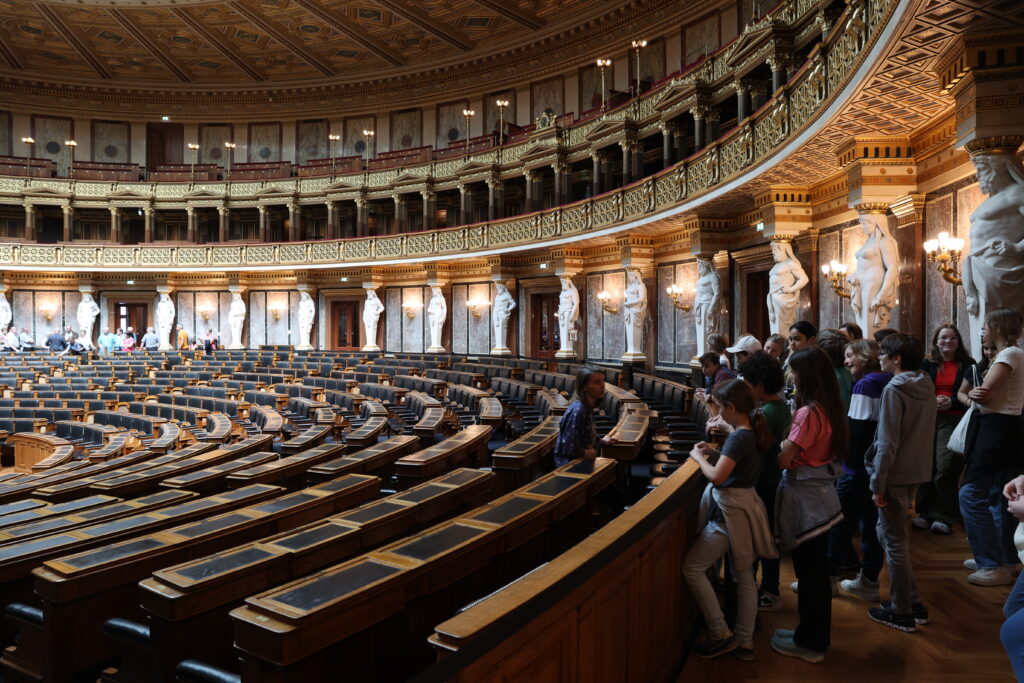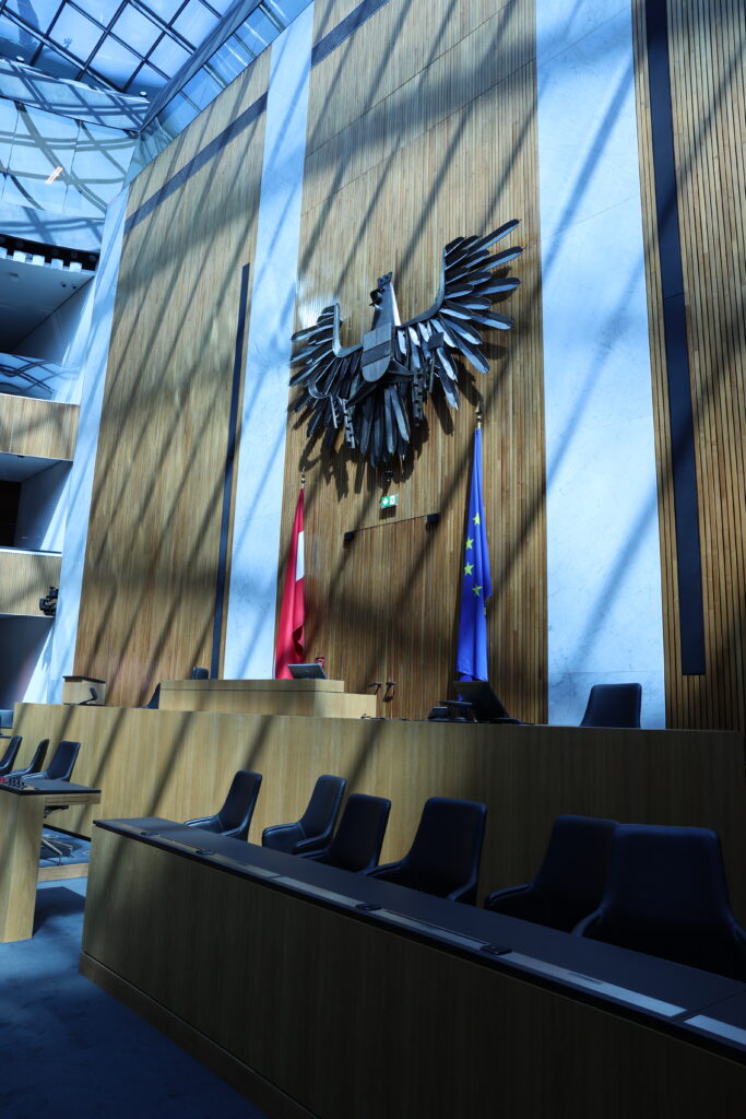 Wir haben den historischen Sitzungssal und den Nationalratssaal besucht. Im historischen Sitzungssaal wird alle sechs Jahre der Bundespräsident vereidigt. Nach dem Zerfall der Monarchie sind unterschiedliche Völker bei Verhandlungen anwesend gewesen, gesprochen wurde allerdings nur Deutsch.