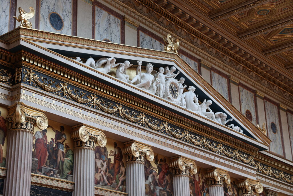 Vor dem Parlament steht eine große Statue, die Athene, mit Nike in ihrer rechten Hand. Athene ist die Göttin der Weisheit und Strategie. Nike ist die Göttin des Sieges in der griechischen Mythologie. Die Pallas Athene steht auf einem großen Sockel in einem Brunnen drinnen, in den die Menschen schon viele Geldmünzen geworfen haben. Die Fenster des Parlaments sind sehr schön geworden und sie sind echt groß. Vor allem der Säulensaal ist auch sehr schön geworden, dort gibt es auch ein Echo, weil er so riesig ist. In den Sälen und auch in den Gängen sind griechische Statuen zu finden.