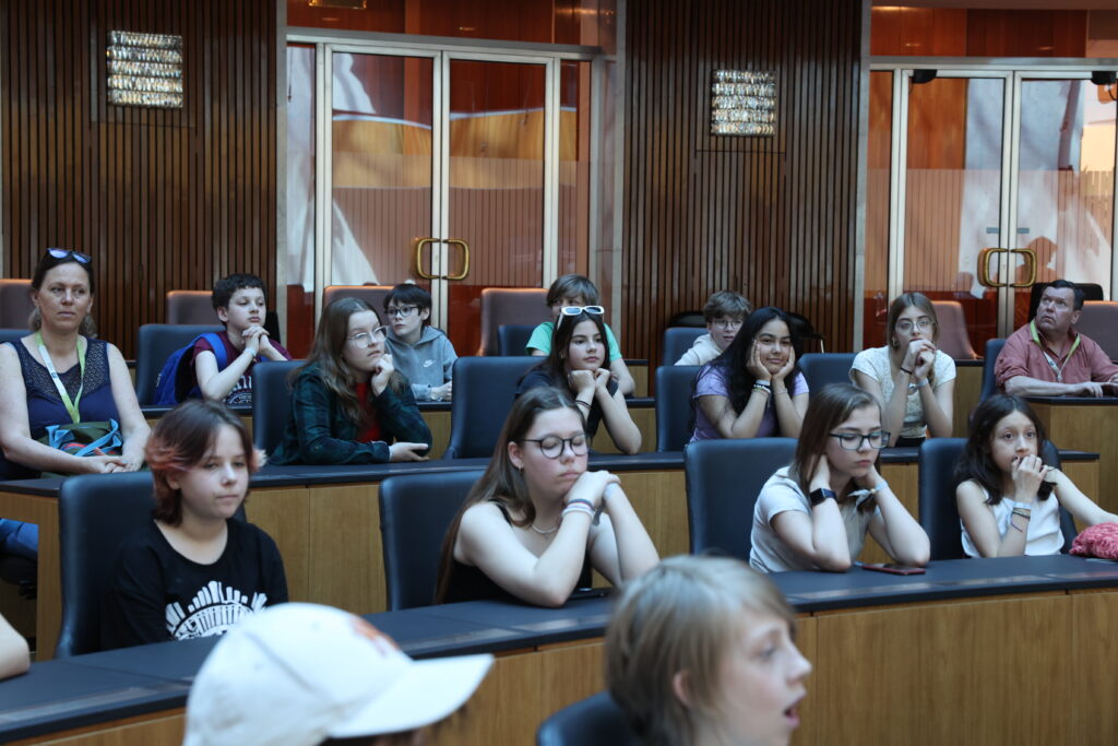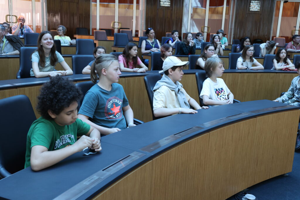 Der Nationalratssaal schaut sehr modern aus und wir durften dort auf den Plätzen der jetzigen Abgeordneten sitzen. Die Sessel sind sehr bequem und auf jedem Tisch gibt es Anschlüsse für Laptops. Das Dach des Saals dunkelt im Sommer von selbst ab, sodass es nicht so heißt innen wird. Wir wissen jetzt auch, dass man bei einer Nationalratssitzung dabei sein darf und diese auch im Fernsehen übertragen wird.