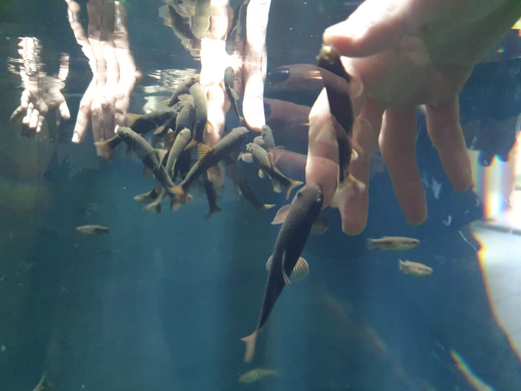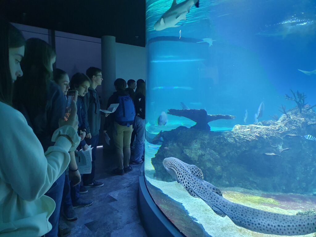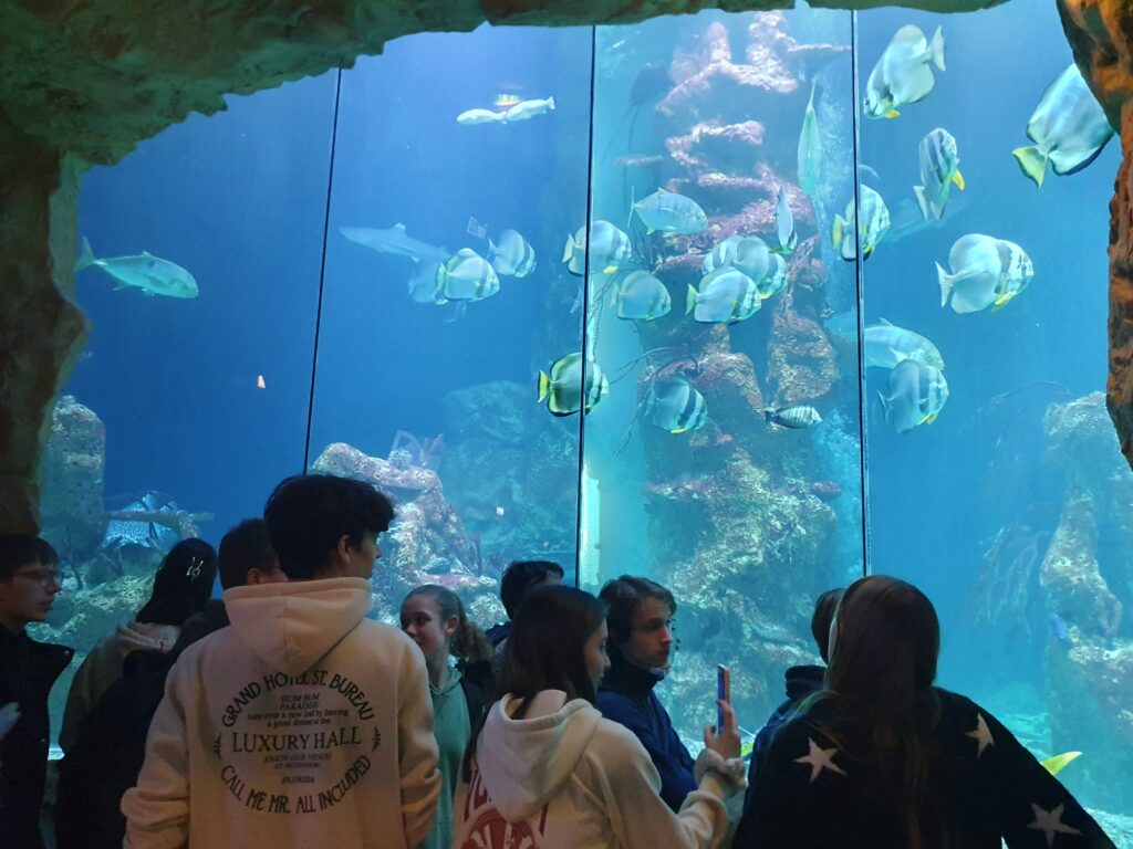 Am ersten Stock sind wir durch den Tunnel gegangen, der sich innerhalb des größten Aquariums, das es dort gibt, befindet. Besonders fielen die Rochen und die Haie auf.