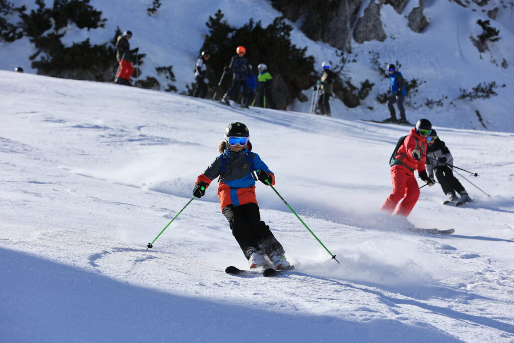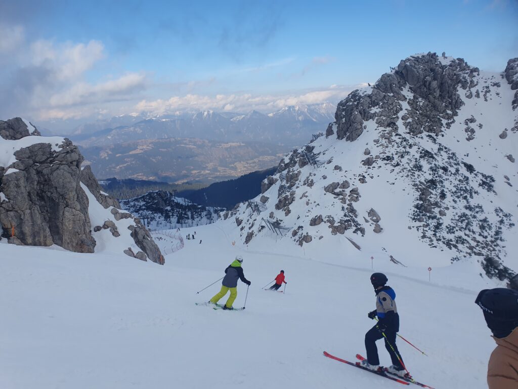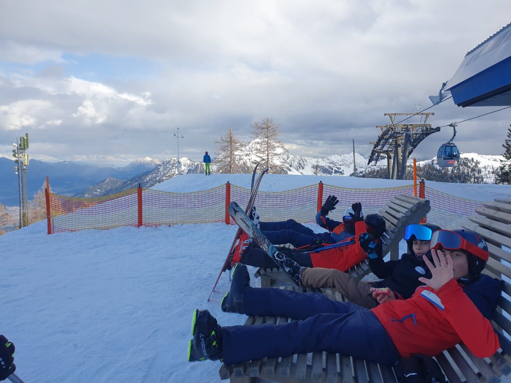 Svea und Sophia: Diesen Februar waren alle dritten Klassen im Nassfeld an der Grenze zu Italien auf Skikurs. Die Reise begann am 17.2. samstagmorgens beim Schubertpark. Die drei Klassen wurden in zwei Busse aufgeteilt, und für uns verging die Fahrt dann ziemlich schnell. Trotz fünfeinhalb Stunden Fahrzeit plus einer Pause in Graz hatten wir immer sehr viel Unterhaltung. Gegen 15 Uhr kamen wir in der Jugendherberge Leitner an. Wir bezogen unsere Zimmer und bekamen alle nötigen Informationen. Unsere erste Mahlzeit war das Abendessen, es gab ein dreigängiges Menü, welches aus einer Suppe, einer Hauptspeise und einem Nachtisch bestand. Dies klingt jetzt sehr luxuriös, allerdings schmeckte uns das Essen nicht sehr gut.