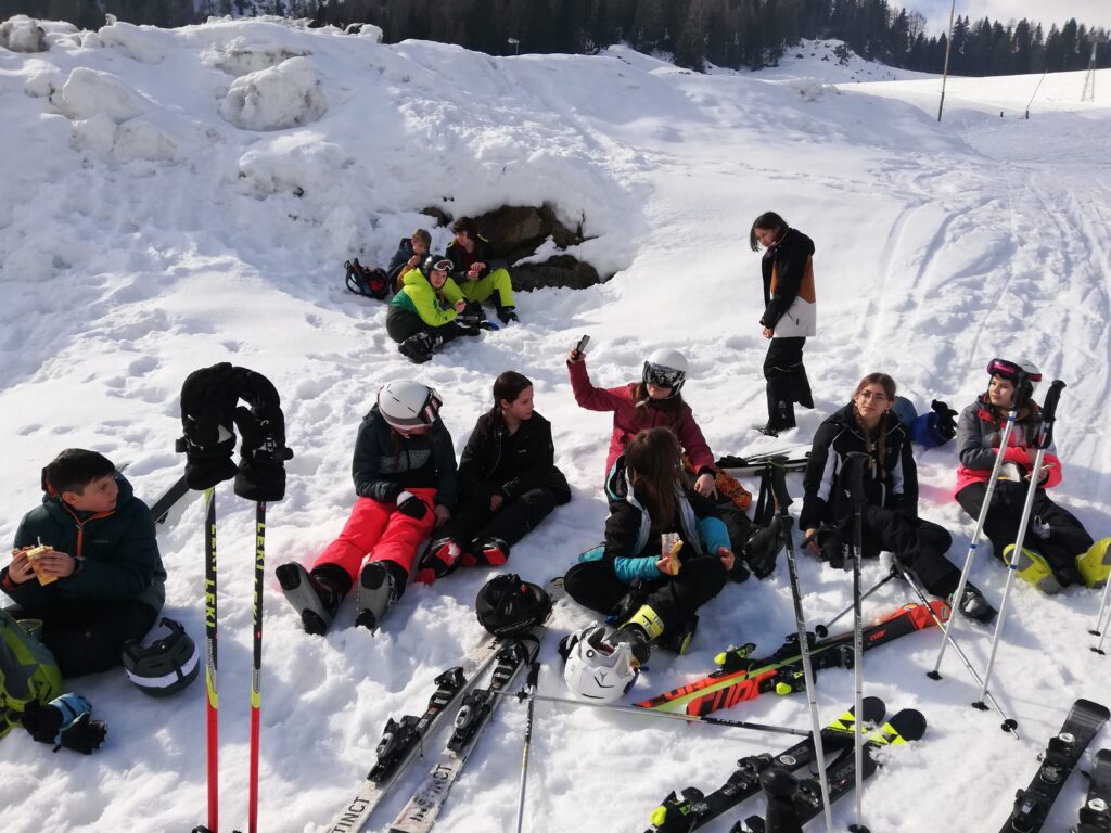 Franziska, Marie, Anna: Der Vormittag war jeden Tag gleich: Wir sind um 8 Uhr frühstücken gewesen und haben uns anschließend auf den Weg zur Piste gemacht. Gegen 13 Uhr waren die Profis hinter einer Hütte auf Bänken und durften ihr Lunchpaket essen. Je nach Können durften die Gruppen selbst entscheiden, wie lang sie noch Ski fahren.