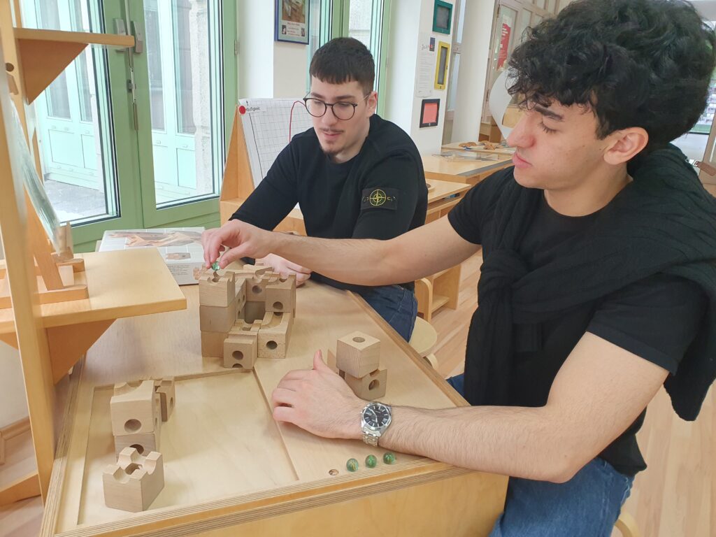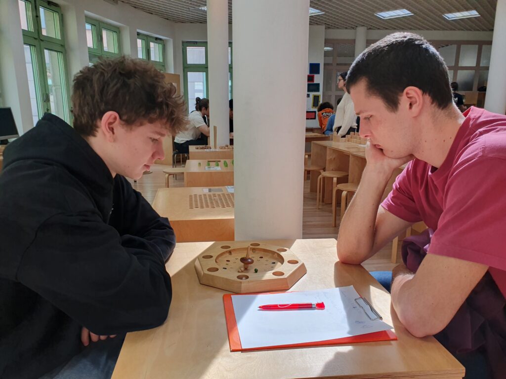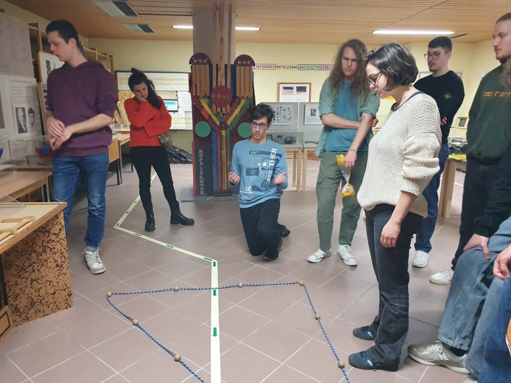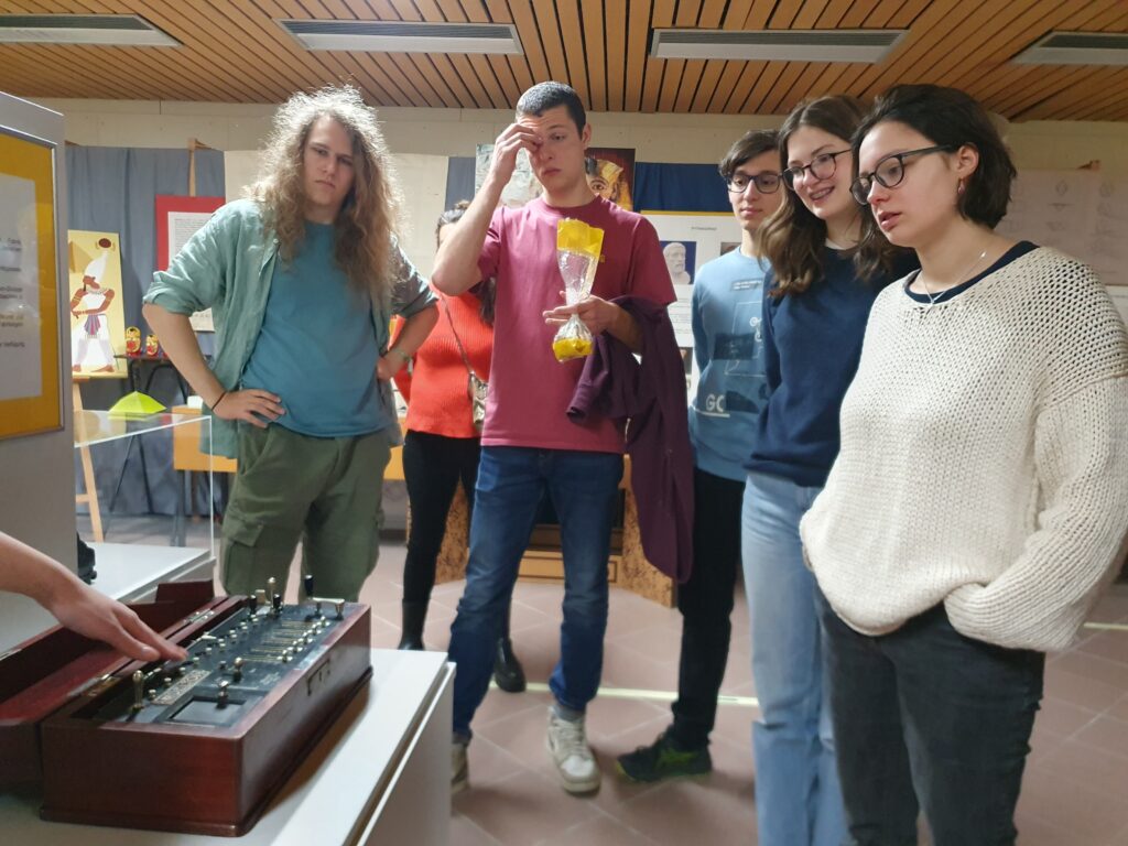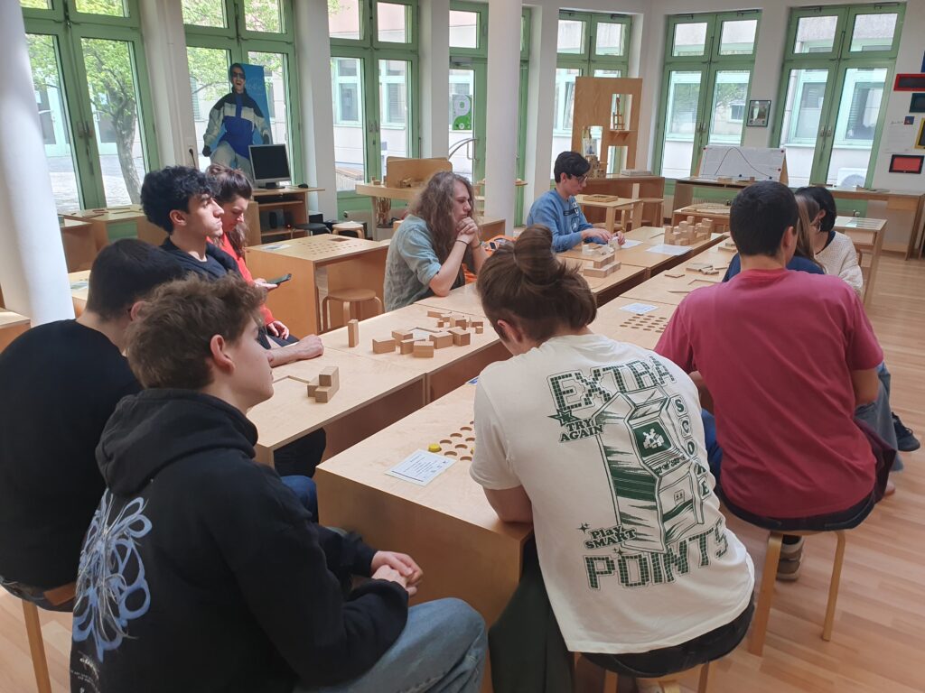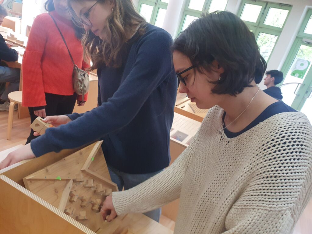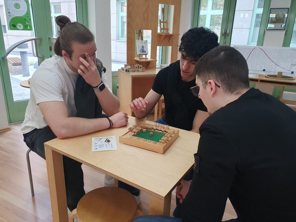 So bewunderte die Klasse die historischen Sammelstücke im Museumsteil wie alte Rechenmaschinen oder riesige Speichermedien. Ein nachgebauter Gerechtigkeitsbecher des Pythagoras und Messinstrumente der alten Ägypter wurden ausprobiert. Auch die Spieletische forderten die Nerven ordentlich – gar nicht so einfach, all diese Aufgaben zu lösen! War schön, euch noch mal in Action zu erleben!
