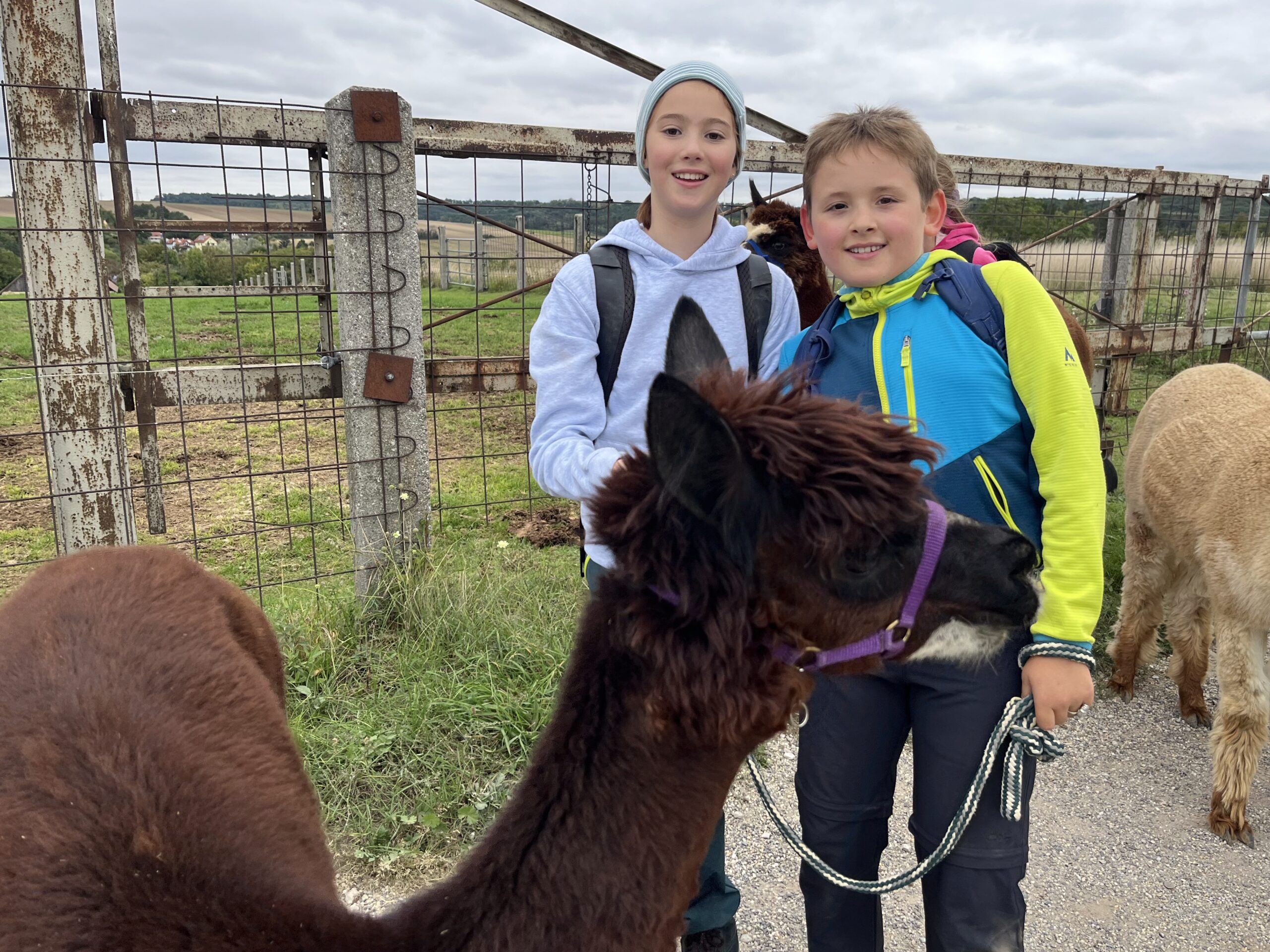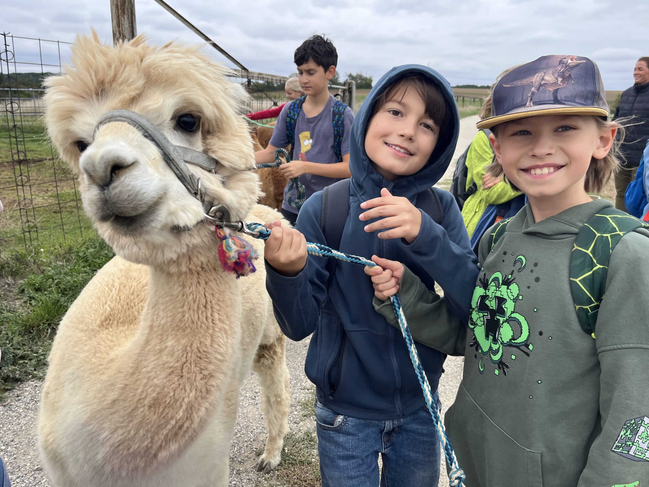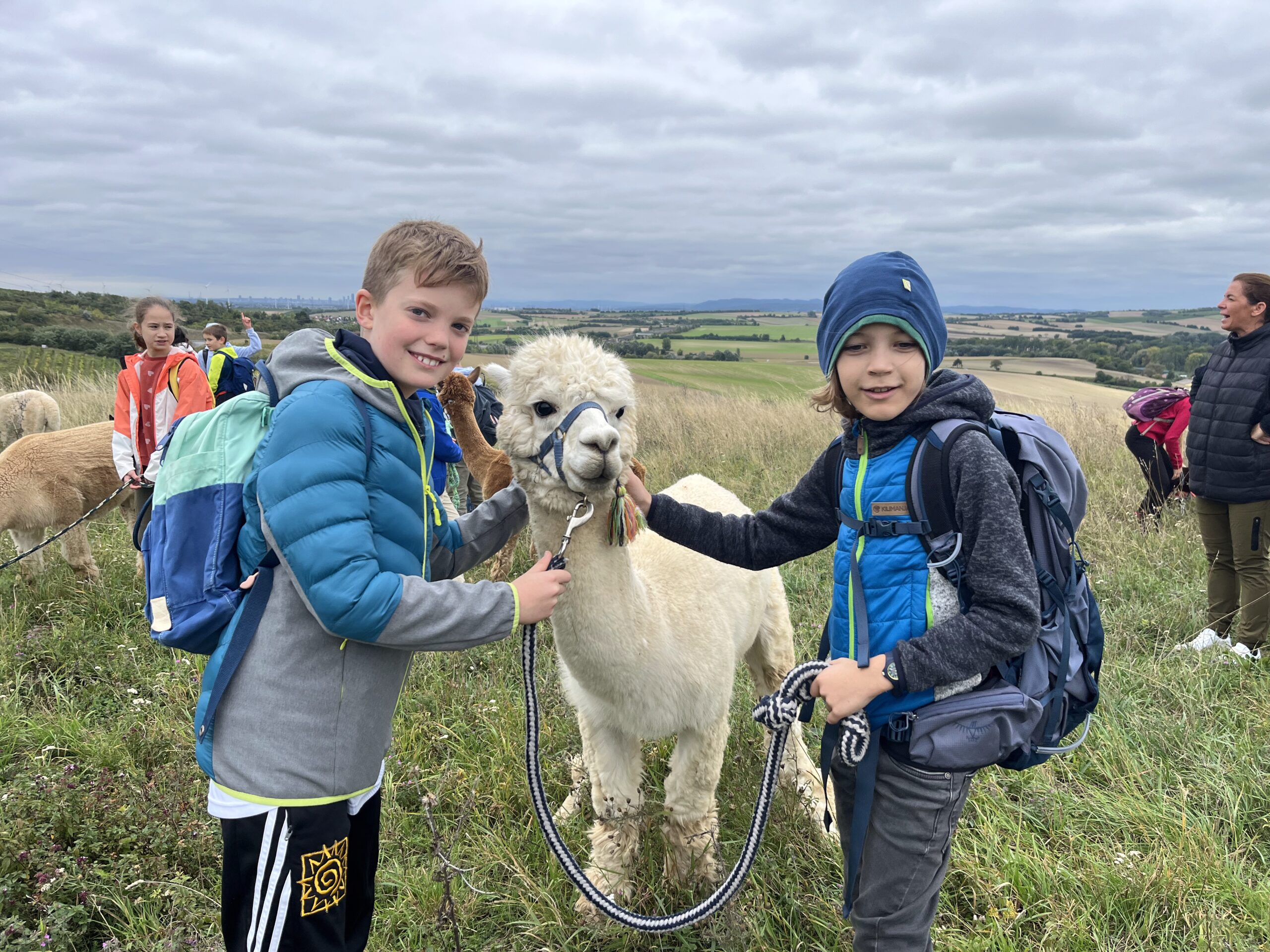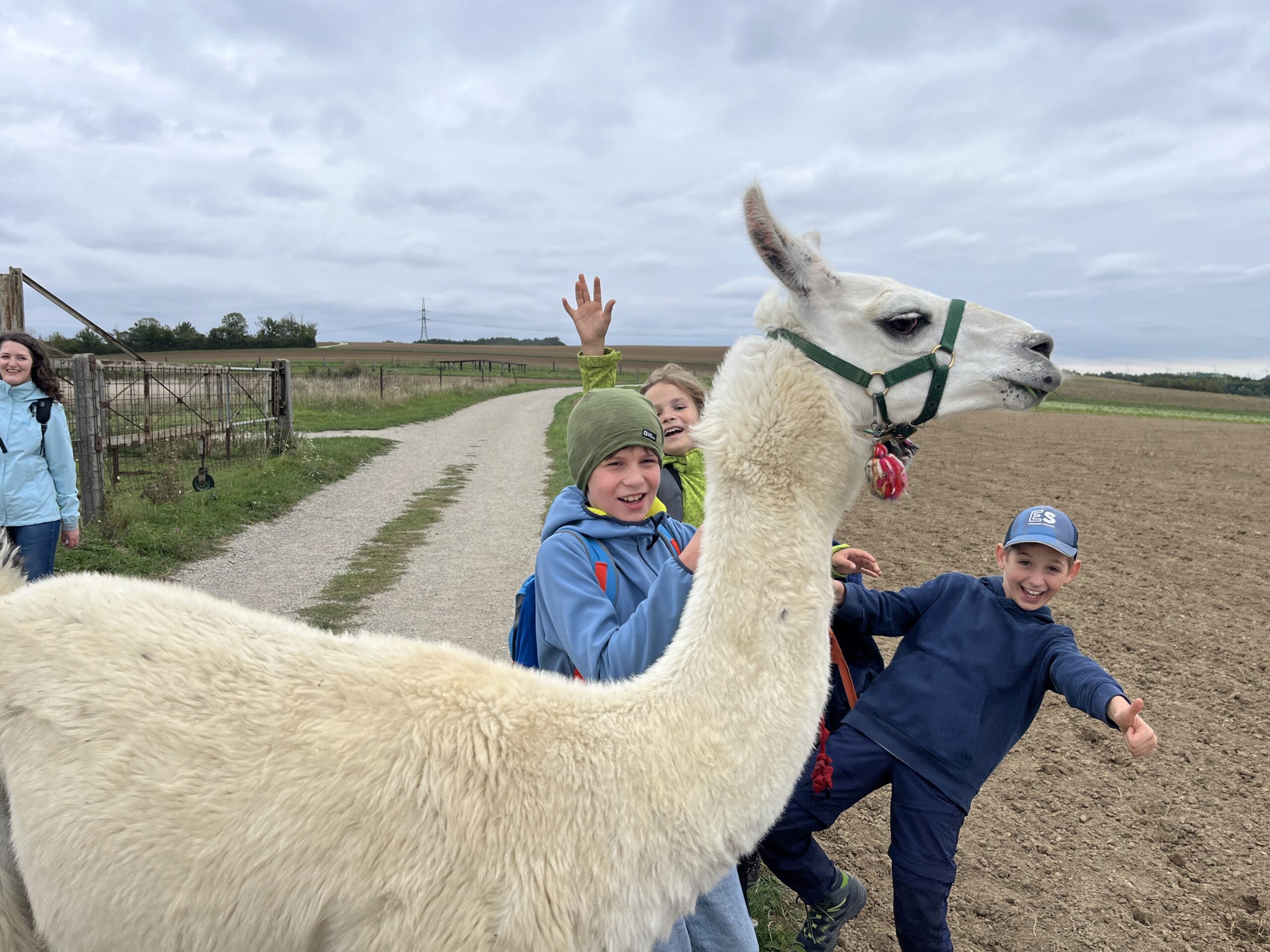 Am 23. September 2025 machten sich die 25 Schüler*innen der 1A in Begleitung von Isabel Valentin und Kathrin Siquans auf nach Riedenthal, um dort mit 15 Alpakas und 2 Lamas durch Wald und Weinberge zu wandern. Bei schönem Herbstwetter und in tierischer Begleitung konnten sich die Kinder untereinander, aber auch ihre neuen Lehrerinnen besser kennenlernen, streichelten Meerschweinchen, kämpften mit störrischen oder blitzschnellen Alpakas und sammelten Steine fürs Begrüßungsfest.