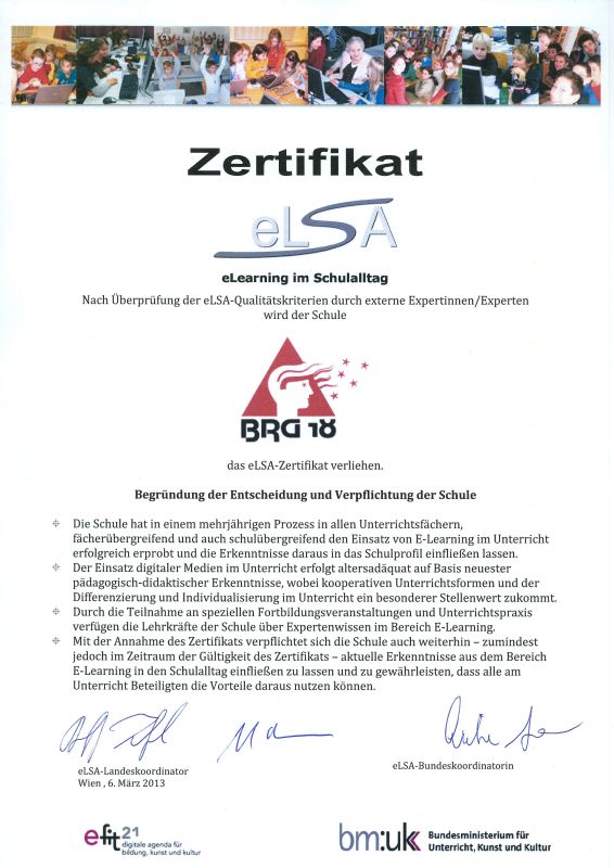 Lange bevor Digitale Grundbildung ein Pflichtfach für die Sekundarstufe 1 (Unterstufe) wurde, war das BRG 18 Vorreiter im Einsatz digitaler Medien nicht nur im Informatikunterricht, sondern in allen Fächern. Aufgrund dieses Engagements unter Federführung von Prof. Anna Klema wurden wir im Jahr 2013 zu einer der ministeriellen eLearning-Pilotschulen: Wir erhielten die ELSA-Zertifizierung.